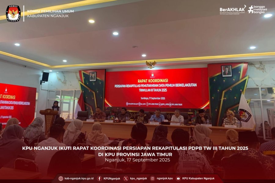 KPU Nganjuk- Divisi Perencanaan Data dan Informasi (Rendatin) Komisi Pemilihan Umum (KPU) Kabupaten Nganjuk, Achmad Zam Zami menghadiri Rapat Koordinasi (Rakor) Persiapan Rekapitulasi Pemutakhiran Data Pemilih Berkelanjutan (PDPB) Triwulan III Tahun 2025 di Aula KPU Provinsi Jawa Timur (Jatim) di Kota Surabaya, Rabu (17/9/2025). Kegiatan yang diselenggarakan KPU Jatim ini mengundang divisi Rendatin dan operator Sidalih KPU Kabupaten/ Kota Se Jawa Timur. Acara dibuka oleh Ketua KPU Jatim, Aang Kunaifi. Dalam sambutannya, Aang menegaskan bahwa terdapat tiga program prioritas nasional yang menjadi perhatian KPU, salah satunya adalah PDPB. Ia juga memberikan penekankan di tengah situasi efisiensi anggaran. “Ada tiga program prioritas nasional yang menjadi fokus KPU, salah satunya adalah PDPB. Meski dalam kondisi efisiensi, kita harus melaksanakan tugas dan fungsi dengan profesionalisme,” tegasnya. Dalam kesempatan itu, peserta diingatkan beberapa langkah penting yang perlu dilaksanakan oleh KPU Kabupaten/Kota sebagai persiapan Rekapitulasi PDPB Triwulan III. Di antaranya pengumpulan data pemilih dari berbagai sumber yang sahih, verifikasi dan validasi, termasuk pencermatan potensi data ganda, penetapan status pemilih Tidak Memenuhi Syarat (TMS), serta perbaikan elemen data yang belum akurat. Selain itu, perlunya koordinasi dengan para pemangku kepentingan terkait untuk memastikan keakuratan dan keterpaduan data. Sementara itu, KPU Nganjuk sedang melaksanakan pencocokan dan penelitian terbatas (Coktas) data pemilih sebagai salah satu upaya pemeliharaan data yang akurat. Coktas ini dilakukan sejak tanggal 10 September 2025 serta dijadwalkan berakhir pada 25 September 2025. (Humas KPU Nganjuk) ....