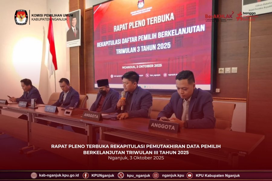 KPU Nganjuk – Komisi Pemilihan Umum (KPU) Kabupaten Nganjuk menggelar Rapat Pleno Terbuka Rekapitulasi dan Penetapan Pemutakhiran Data Pemilih Berkelanjutan (PDPB) Triwulan III Tahun 2025 pada Jumat (3/10/2025). Kegiatan yang berlangsung di Aula Demokrasi KPU Nganjuk ini dimulai pukul 09.00 WIB hingga selesai. Rapat pleno dibuka secara resmi oleh Anggota KPU Kabupaten Nganjuk, Nanang Wahyudi selaku Ketua Divisi Hukum dan Pengawasan. Selanjutnya, jalannya pleno dipimpin oleh Achmad Zam Zami, Ketua Divisi Perencanaan Data dan Informasi (Rendatin) KPU Nganjuk. Sebelum masuk pada agenda utama, ia terlebih dahulu membacakan tata tertib rapat serta memastikan kehadiran para undangan. Dalam kesempatan itu, Achmad Zam Zami memaparkan rekapitulasi daftar pemilih berkelanjutan dari seluruh desa dan kecamatan di Kabupaten Nganjuk. Usai pembacaan rekapitulasi PDPB, ia memberi kesempatan kepada peserta rapat untuk menyampaikan saran maupun masukan. Pleno kemudian ditutup dengan penyerahan salinan berita acara kepada undangan. Selain dihadiri jajaran internal KPU Kabupaten Nganjuk, rapat pleno juga melibatkan berbagai instansi eksternal. Undangan ini terdiri dari unsur Badan Pengawas Pemilu (Bawaslu) Kabupaten Nganjuk, Komando Distrik Militer (Kodim) 0810 Nganjuk, Kepolisian Resor (Kapolres) Nganjuk, Asisten Pemerintahan Kabupaten Nganjuk, Dinas Kependudukan dan Pencatatan Sipil (Dispendukcapil) Kabupaten Nganjuk, Dinas Komunikasi dan Informatika (Infokom) Kabupaten Nganjuk, Kementerian Agama (Kemenag) RI Kabupaten Nganjuk, Pengadilan Agama Kabupaten Nganjuk, Rumah Tahanan Negara (RUTAN) Kelas II-B Nganjuk, dan Badan Kesatuan Bangsa dan Politik (Bakesbangpol) Kabupaten Nganjuk dan Kantor Cabang Dinas (Cabdin) Pendidikan Provinsi Jawa Timur Wilayah Nganjuk. Achmad Zam Zami mengatakan, pihaknya melakukan PDPB sebagai bagian dari menjaga kualitas demokrasi. “Melalui PDPB, KPU berupaya memelihara dan memperbarui DPT Pemilu maupun Pemilihan terakhir secara berkelanjutan. Data ini disiapkan untuk penyusunan DPT berikutnya dengan tetap menjaga kerahasiaan pemilih. Selain itu, PDPB juga menyediakan informasi pemilih berskala nasional yang komprehensif, akurat, dan mutakhir,” ungkapnya. Ia juga menyampaikan bahwa hasil rekapitulasi PDPB Triwulan III Tahun 2025 di Kabupaten Nganjuk mencapai 888.787 pemilih. Dengan rincian 443.073 laki-laki dan 445.714 perempuan yang tersebar di 284 desa/kelurahan. Lebih lanjut, ia menjelaskan bahwa sasaran PDPB adalah warga negara Indonesia yang sudah genap berusia 17 tahun atau lebih, sudah menikah, atau pernah menikah, serta memenuhi syarat sebagai pemilih sesuai ketentuan perundang-undangan. “Prinsipnya, setiap warga yang memenuhi syarat akan dicatat, termasuk mereka yang baru pindah domisili. Namun ada pula yang dikecualikan, misalnya anggota TNI/Polri aktif atau yang sedang dicabut hak politiknya berdasarkan putusan pengadilan,” jelasnya. KPU Kabupaten Nganjuk menegaskan bahwa kegiatan ini merupakan tindak lanjut dari amanat Undang-Undang Nomor 7 Tahun 2017 tentang Pemilihan Umum serta Peraturan KPU Nomor 1 Tahun 2025. Melalui pleno ini, data pemilih terus diperbarui agar tetap mutakhir dan sinkron dengan data kependudukan nasional. Adapun jajaran internal KPU Nganjuk yang hadir dalam kegiatan ini mulai dari Ketua KPU Nganjuk, Arfi Musthofa beserta empat anggota lainnya. Yaitu Nanang Wahyudi, Yusuf Setyawan, Achmad Zam Zami, dan Romza. Serta jajaran sekretariat KPU Kabupaten Nganjuk. (Humas KPU Nganjuk) ....