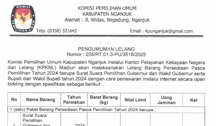 KPU Nganjuk- Pengumuman Lelang Komisi Pemilihan Umum Kabupaten Nganjuk melalui Kantor Pelayanan Kekayaan Negara dan Lelang (KPKNL) Madiun akan melaksanakan Lelang Barang Milik Negara berupa Paket Barang Persediaan Surat Suara Pemilihan Gubernur dan Wakil Gubernur, Bupati dan Wakil Bupati Serentak Tahun 2024 dengan cara penawaran melalui internet secara open bidding. Pengumuman selengkapnya dapat diunduh Disini. ....