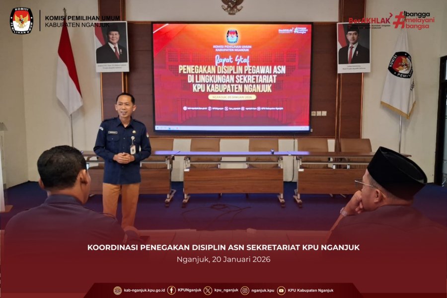 KPU Nganjuk- Sekretaris Komisi Pemilihan Umum (KPU) Kabupaten Nganjuk, Kristanto menegaskan pentingnya penegakan disiplin Aparatur Sipil Negara (ASN) sebagaimana diatur dalam Peraturan Pemerintah Nomor 94 Tahun 2021 tentang Disiplin Pegawai Negeri Sipil. Penegasan tersebut disampaikan dalam kegiatan Rapat Staf KPU Nganjuk yang dilaksanakan pada Selasa (20/1/2026).