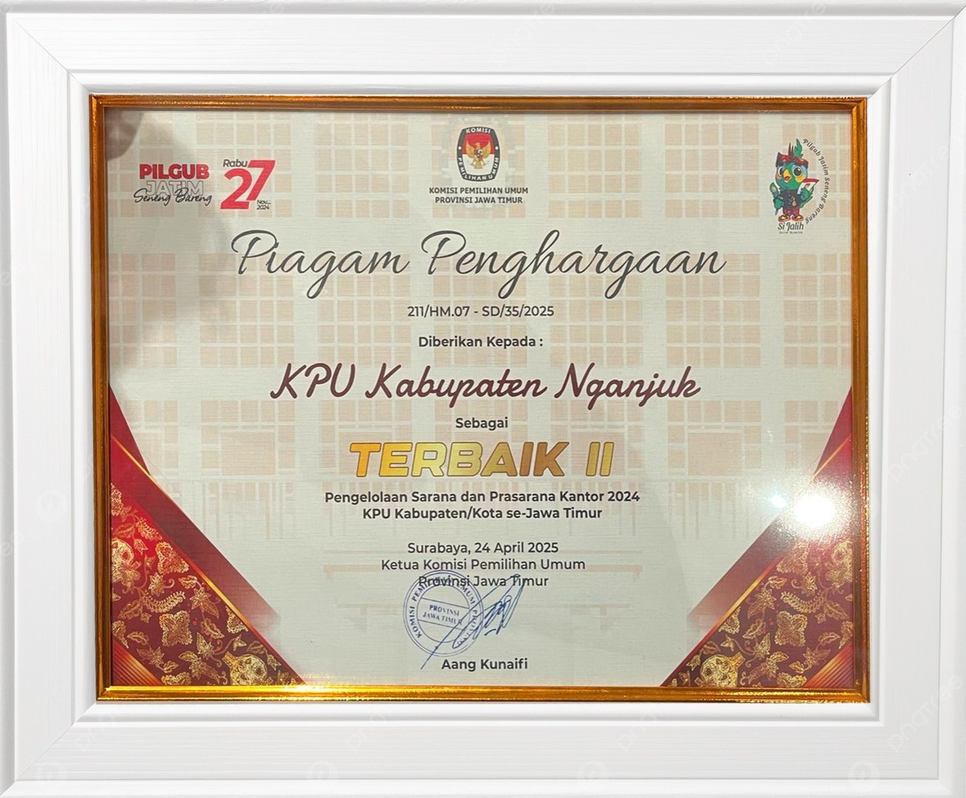KPU Nganjuk- Komisi Pemilihan Umum (KPU) Kabupaten Nganjuk mendapat dua penghargaan sekaligus dari KPU Provinsi Jawa Timur (Jatim). Penghargaan tersebut diterima KPU Kabupaten Nganjuk saat acara Rapat Pimpinan (Rapim) Evaluasi Penyelenggaraan Pilkada Serentak Tahun 2024 di Hotel JW Marriot Surabaya, Kamis (24/4/2025).