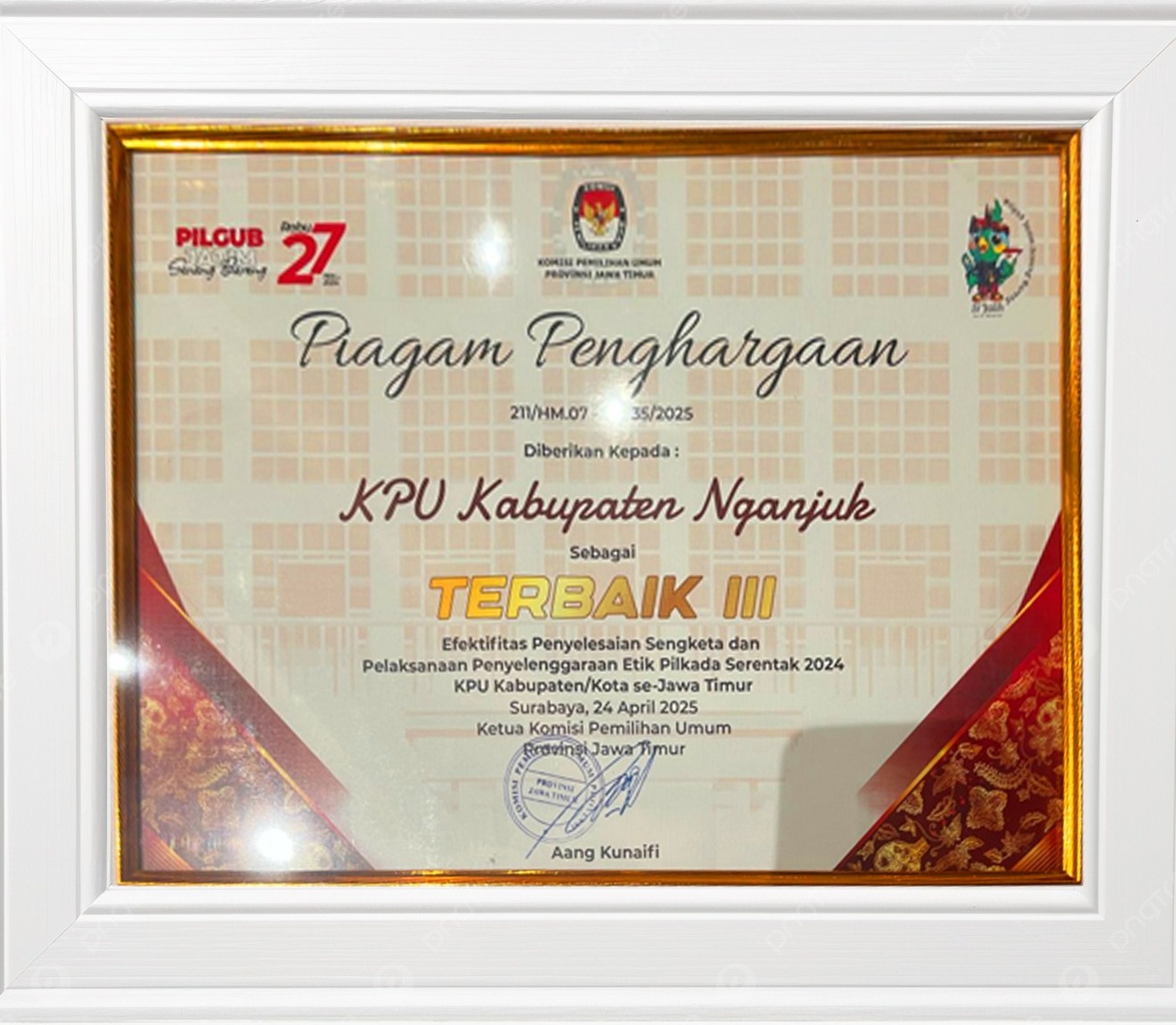 Penghargaan pertama yang didapat KPU Kabupaten Nganjuk yaitu terbaik II pengelolaan sarana dan prasarana kantor 2024. Sedangkan penghargaan lainnya yang diberikan KPU Jatim kepada KPU Kabupaten Nganjuk adalah terbaik III efektivitas penyelesaian sengketa dan pelaksanaan penyelenggaraan etik Pilkada serentak 2024.