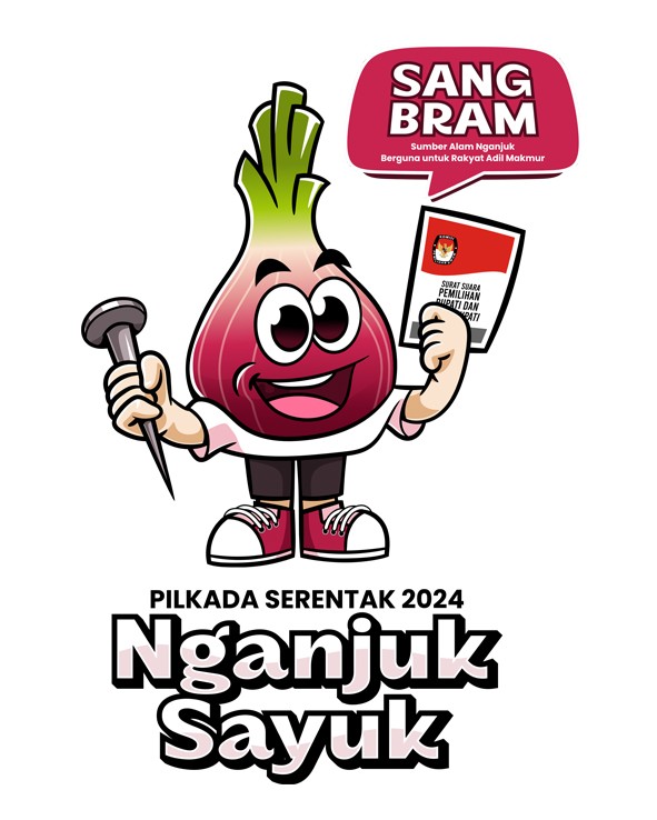 - Maskot Pemilihan Bupati dan Wakil Bupati Nganjuk Tahun 2024 adalah SANG BRAM yang merupakan karakter dengan kepala berbentuk dasar bawang merah yang berwarna merah muda bergradasi ungu, putih dan hijau dengan bagian atas terdapat lima helai daun berwarna hijau yang terpangkas rapi, dua mata, mulut yang ceria, tangan kanan kuning langsat memegang paku, tangan kiri kuning langsat memegang surat suara, mengenakan kaos berwarna putih, celana hitam, sepatu kets berwarna kombinasi putih dan merah muda keunguan.