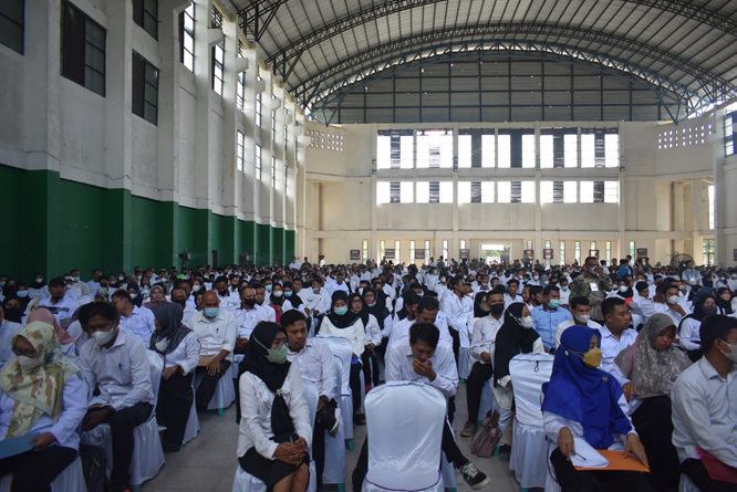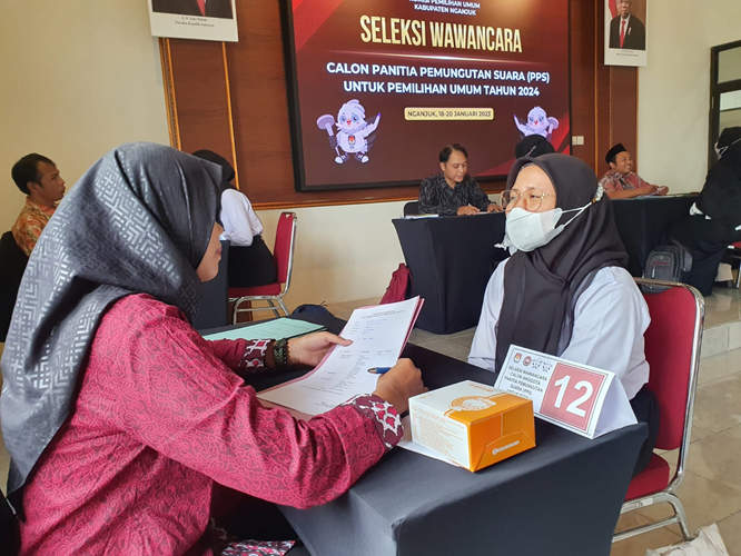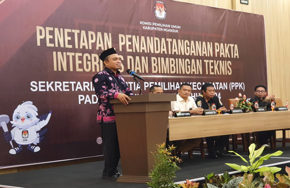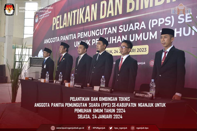 KPU Nganjuk- Pada Selasa 24 januari 2023, Setelah melaksanakan serangkaian Seleksi Pendaftaran, Seleksi Tes Tulis dan Seleksi Tes Wawancara KPU Kabupaten Nganjuk Gelar Pelantikan dan Pengambilan Sumpah/Janji dan Bimbingan Teknis Anggota Panitia Pemungutan Suara Untuk Pemilihan Umum Tahun 2024, yang digelar di GOR Bungkarno Kabupaten Nganjuk Jl. Barito Nganjuk. Pelantikan dihadiri oleh 284 (dua ratus delapan puluh empat) desa yang tersebar di 20 Kecamatan di Nganjuk. Acara Pelantikan dimulai dengan Pembacaan Surat Keputusan Komisi Pemilihan Umum Tentang Penetapan Anggota Panitia Pemungutan Suara Pemilihan Umum 2024 yang tersebar di 20 Kecamatan Kabupaten Nganjuk. Keputusan dibacakan oleh Ketua Panitia Pemilihan Kecamatan. Selanjutnya Pengambilan sumpah/janji oleh Ketua KPU Kabupaten Nganjuk yang diikuti oleh Seluruh Anggota Panitia Pemungutan Suara dan dilanjutkan dengan penandatanganan Berita Acara Pelantikan oleh Perwakilan Panitia Pemungutan Suara Bersama Rohaniawan dan Ketua KPU Kabupaten Nganjuk. Turut Hadir Dalam acara Pelantikan dan sumpah/janji Plt. Bupati Nganjuk (Dr. Drs. H Marhaen Djumadi, S.E., S.H., M.M., MBA) yang turut memeberikan sambutan dan mengucapkan selamat dan sukses kepada anggota Panitia Pemungutan Suara terpilih” jadikan ini sebagai sarana untuk ibadah dalam melayani masyarakat nganjuk, beliau juga mengungkapkan bahwa PPS merupakan ujung tombak dari KPU Kabupaten Nganjuk dalam melaksanakan tahapan - tahapan dalam Pemilihan Umum Tahun 2024, semoga pemilihan umum 2024 dapat berjalan dengan lancar, aman dan damai, Panitia Pemungutan Suara merupakan wadah bagi masyarakat untuk bertanya, protes dan mengeluh terkait hal hal Pemilihan Umum, diberikan informasi yang jelas kepada masayarakat tidak ada salahnya belajar tentang regulasi-regulasi terkait pemilihan umum, plt bupati nganjuk juga berpesan untuk bersama sama menjaga nganjuk biar tetap aman dan kondusif “. (WR)