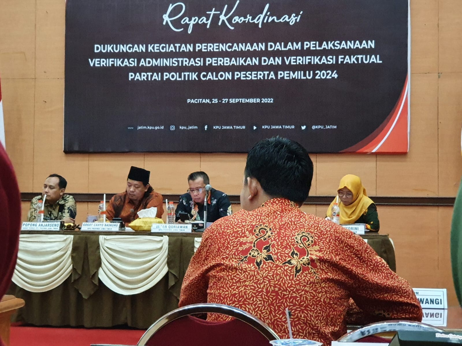 KPU Nganjuk- Komisi Pemilihan Umum (KPU) Kabupaten Nganjuk mengikuti Rapat Koordinasi (Rakor) Dukungan Kegiatan Perencanaan dalam Pelaksanaan Verifikasi Administrasi (Vermin) Perbaikan dan Verifikasi Faktual (verfak) Partai Politik Calon Peserta Pemilu 2024 pada 25-27 September 2022, mulai pukul 15.30 WIB sampai dengan selesai. Rakor bertempat di Kabupaten Pacitan, tepatnya di gedung Karya Dharma Pemerintah Kabupaten Pacitan, jalan Jaksa Agung Suprapto Nomor 8 Pacitan. Dengan diikuti Divisi Teknis Penyelenggaraan, Kasubbag Tekmas, dan admin/verifikator Sistem Informasi Politik (Sipol) dari 38 KPU Kabupaten/Kota di Jawa Timur. Rakor dibuka oleh Divisi Hukum dan Pengawasan KPU Jatim, Muhammad Arbayanto. Dalam sambutannya disampaikan bahwa saat ini tengah memasuki rentang waktu tahapan verifikasi Parpol Calon Peserta Pemilu 2024. Ujungnya nanti pada tanggal 14 Desember 2022 yakni penetapan parpol peserta pemilu 2024. “Mungkin saja pasca penetapan parpol peserta pemilu 2024 akan ada sengketa penetapan parpol peserta pemilu ini,” kata Arbayanto. (Run)