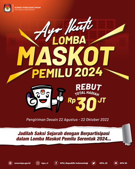 KPU Nganjuk- Pada Tanggal 16 Agustus 2022 KPU RI Melalui Laman Website kpu.go.id dan Media Sosial Lainya telah memberikan pengumuman Lomba Maskot Pemilu 2024 dengan Total Hadiah sebesar 30 Jt. Lomba dapat diikuti oleh Masyarakat Umum dengan syarat dan ketentuan yang berlaku, dimana untuk pengiriman Desain dimulai pada tanggal 22 Agustus – 22 Oktober 2022. Adapun Ketentuan Umum Lomba Maskot Pemilu 2024 diantaranya: Peserta yang berhak mengikuti Lomba adalah Masyarakat Umum (WNI) yang dibuktikan dengan identitas diri KTP/SIM/Kartu Mahasiswa/Pelajar atau identitas diri lainya yang sah; Seluruh pejabat dan pegawai KPU RI Panitia penyelenggara adhoc dan tim juri lomba dilarang mengikuti lomba; Peserta tidak dipungut biaya pendaftaran (gratis) dan mendaftarkan diri ke KOmisi pemilihan Umum RI dengan mengisi formular pendaftaran dan mengupload karya beserta scan pernyataan karya asli di website KPU RI https://bit.ly/LombaMaskotPemilu2024 Karya bersifat nasional dan tidak mengandung unsur SARA serta pornografi; Setiap peserta dapat karya asli yang dapat dipertanggungjawabkan, belum pernah dipublikasikan atau diikutsertakan dalam lomba apapun, dibuktikan dengan surat pernyataan yang ditandatangani diatas materai Rp.10.000,- Download Surat pernyataan di https://www.kpu.go.id/public/kab-nganjuk/dmdocument/1661488477Form%20Surat%20Pernyataan.pdf Peserta dapat mengirimkan karyanya mulai tanggal 22 Agustsu batas akhir pengiriman tanggal 22 Oktober 2022 Kriteria penilaian meliputi keaslian, kreatifitas, komunikatif, inspiratif, estetika,totalitas (Keutuhan) dan mencerminkan pemilu sebagai sarana integritas bangsa; Pemenang Lomba akan dihubungi oleh KPU RI; Apabila sebagai pemenang ternyata bukan hasil karya asli peserta , maka ditetapkan sebagai pemenang lomba dibatalkan dan pemenang mengembalikan hadiahyang telah diterima dan akan dikenakan sanksi sesuai dengan peraturan perundang-undanagan; Karya terpilih pemenang terbaik menjadi milik KPU dan akan dipergunakan untuk kebutuhan sosailisasi. KPU tidak mengembalikan hasilkarya yang dikirimkan peserta; KPU memiliki hak eksekutif terhadap karya pemenang untuk mengubah atau menyempurnakan karya yang telah terpilih sebagai pemenang sesuai dengan kebutuhan; Keputusan dewan juri bersifat mutlak dan tidak dapat diganggu gugat; Materi peserta yang tidak terpilih tidak dikembalikan dan tidak akan dipergunakan oleh KPU. Ketentuan Khusus Lomba Maskot Desain maskot harus mencantumkan logo KPU yang dapat diunduh di website KPU; Desain maskot harus mencantumkan logo KPU yang dapat diunduh di website KPU; Desain Maskot Harus mencerminkan nilai demokrasi, nonpartisan, dinamis, menarik, memotivasi untuk mengajak masyarakat menggunakan hak pilih pada pemilu serentak tahun 2024 dan pemilu sebagai sarana integritas bangsa; Aplikasi dapat diaplikasikan diberbagai media sosial KPU;dalam format JPEG resolusi 300 dpi maksimal 4 MB; Desain yang dikirimkan harus disertai penjelasan singkat (mak 100 – 150 kata) tentang konsep/ide dari dari desain mascot dan nama karakter mascot; Jika peserta masuk menjadi finalis, wajib mengirimkan file asli dalam format victor base. Mengisi formular pendaftaran pada link berikut : https://bit.ly/LombaMaskotPemilu2024