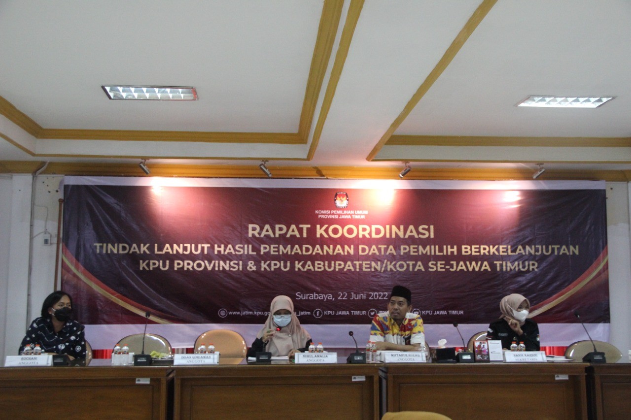 KPU Nganjuk- Anggota KPU Kabupaten nganjuk MUCHIYIN menghadiri undangan Dalam Rapat Koordinasi Tindak Lanjut Hasil Pemadaan Data Pemilih Berkelanjutan Sebagaimana diketahui kegiatan tersebut berdasarkan surat dinas Ketua KPU Provinsi Jawa Timur Nomor : 1386/PL.01.2-Und/35/2022 Perihal Tindak Lanjut Hasil Pemadaan Data Pemilih Berkelanjutan Semester 2 Tahun 2021 dengan Data Kependudukan Kementerian Dalam Negeri Republik Indondesia yang dihadiri oleh Anggota KPU Kabupaten/Kota Divisi Perencanaan Data & Informasi se-Jawa Timur. (22/6) Dalam acara tersebut dihadiri oleh Komisioner KPU Provinsi Jawa Timur Divisi Perencanaan & Logistik Miftahur Rozak, Divisi Rendatin Perencanaan Data dan Informasi Nurul Amaliyah, serta Sekretaris KPU Provinsi Nanik Karsini dan Kabag Rendatin Nurita Paramita. Ibu Nurul selaku Devisi rendatin dalam sambutanya menyampaikan agar selalu menjaga ketelitian dan kehati-hatian dalam melakukan pencoretan data ganda karena apabila kita salah dalam melakukan pencoretan berakibat hilangnya hak konstitusi warga dalam mendapatkan hak pilihnya. beliau juga kembali mengingatkan bahwa sejak tanggal 14 Juni tahapan telah dimulai, Untuk itu jargon KPU telah berubah menjadi "KPU melayani, integritas 24 jam. (Yin)