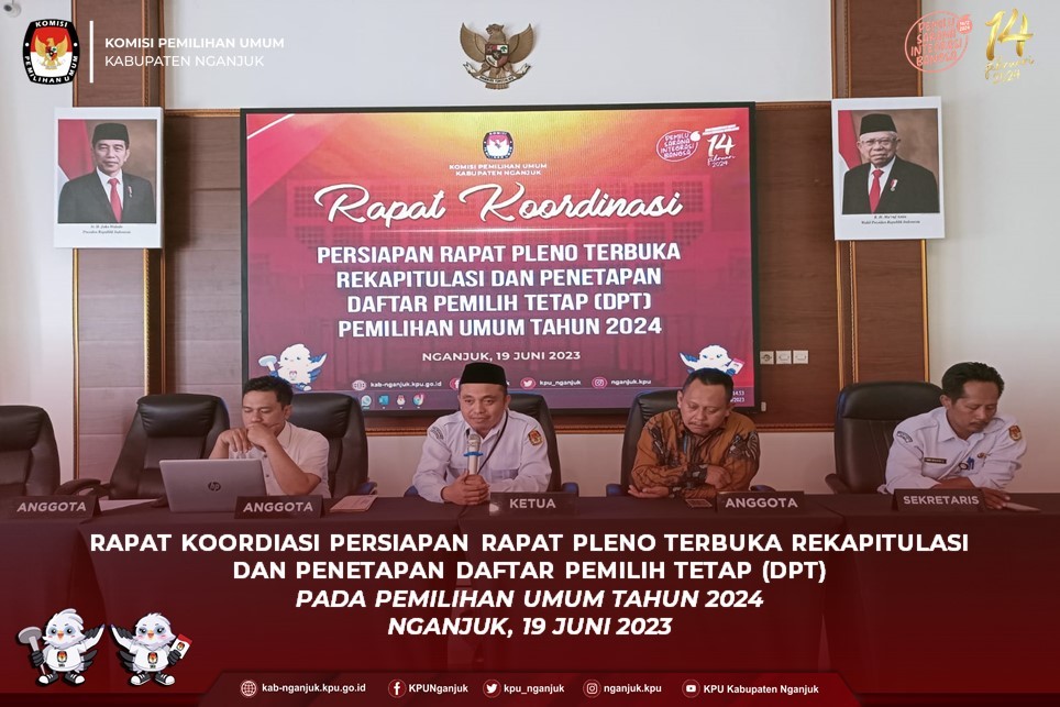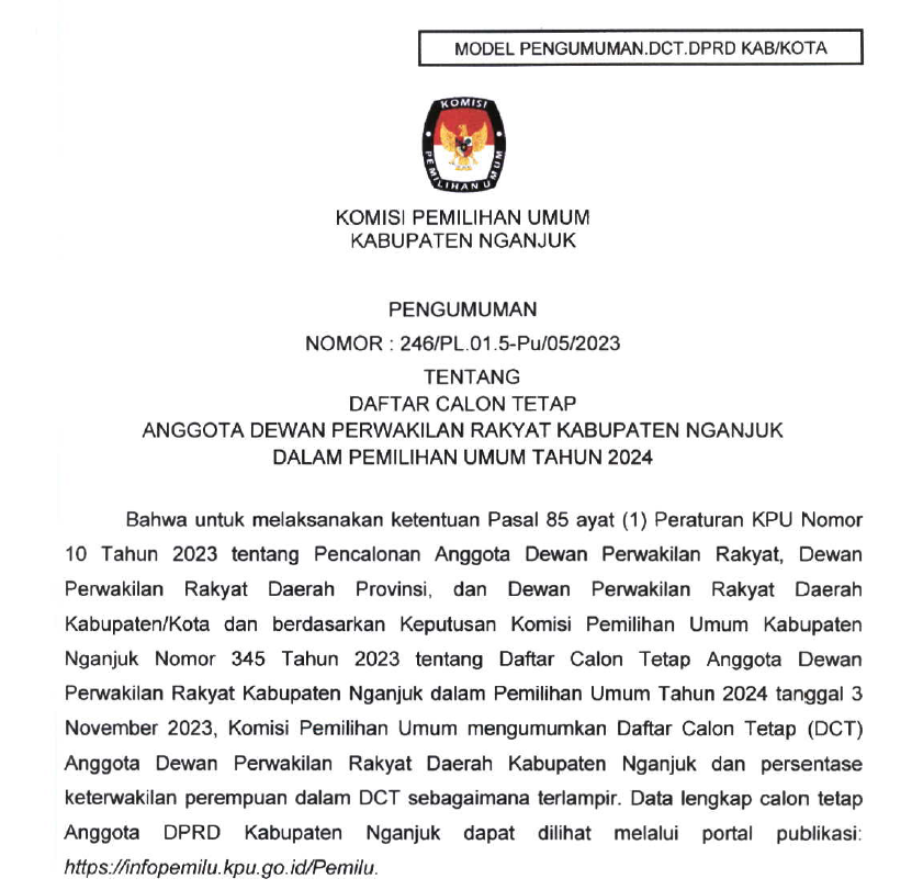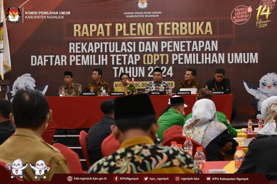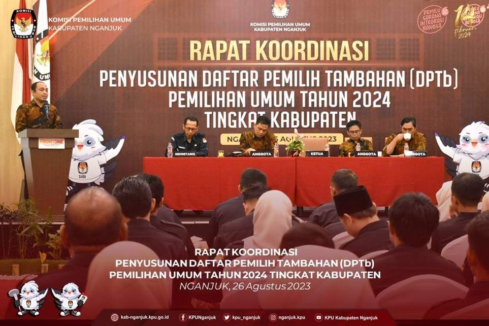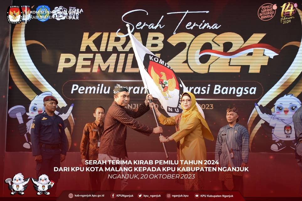 KPU Nganjuk- KPU Kabupaten Nganjuk menggelar Serah Terima Kirab Pemilu Tahun 2024 dengan tema Pemilu Sebagai Sarana Integrasi Bangsa dari KPU Kota Malang kepada KPU Kabupaten Nganjuk Bertempat di Monumen 20 Pilar Alun-Alun Nganjuk, rombongan Kirab KPU Kota Malang ini membawa Bendera Merah Putih, Bendera Pataka KPU dan Bendera Partai Politik Peserta Pemilu 2024 yang kemudian diterima oleh KPU Kabupaten Nganjuk. Acara dihadiri oleh Forkopimda Nganjuk, KPU Provinsi Jawa Timur, KPU Kota Malang, Ketua Partai Politik Peserta Pemilu 2024, OPD Di Lingkungan Pemerintah Kabupaten Nganjuk, Camat se-Kabupaten Nganjuk, Tokoh Agama, Tokoh Masyarakat, Akademisi, Perbankan, Ormas, Kelompok Disabilitas, PPK se-Kabupaten Nganjuk, PPS se-Kabupaten Nganjuk dan Undangan lainnya. Kegiatan diawali dengan Defile/Iring-Iringan 2 Motor Sweeper Moge, Mobil Patwal, Drumband, Jagat Saksana KPU Nganjuk yang membawa bendera Merah Putih dan bendera Pataka KPU, Paskibraka sebagai pembawa 18 Bendera Partai Politik, Bentang Bendera Merah Putih sepanjang 45 meter sebagai bentuk narasi Pemilu Sarana Intergrasi Bangsa oleh 74 PPS, Rombongan Karnival sebanyak 20 Talent dari SMA dan SMK di Kabupaten Nganjuk, Rombongan Seni Budaya (Jaranan, Reog, Barongsai), Rombongan PPK dan PPS, Rombongan KPU Kota Malang dan ditutup Rombongan Flashmob Jingle Pemilu 2024.