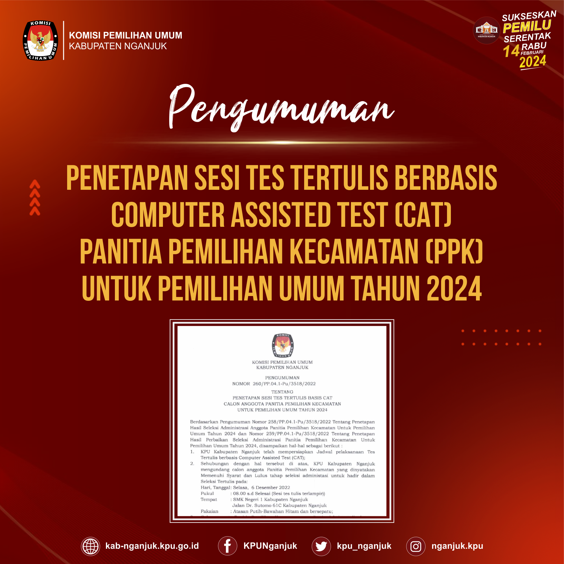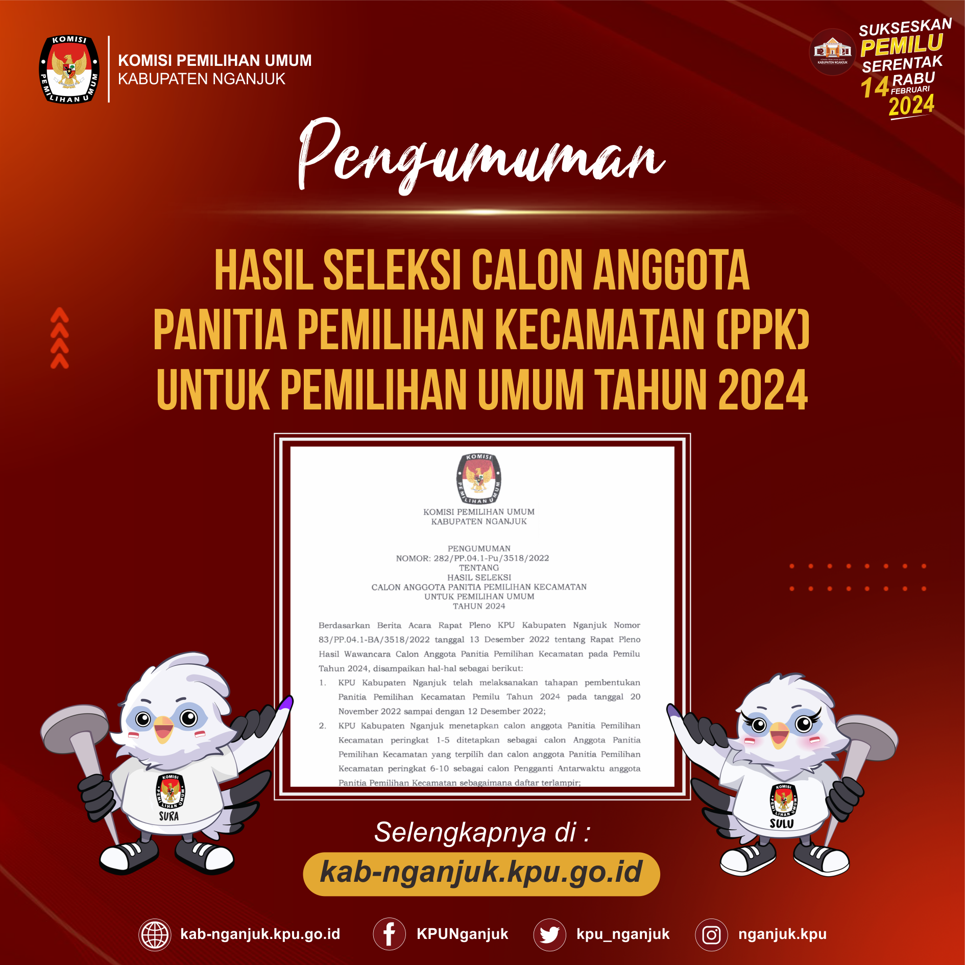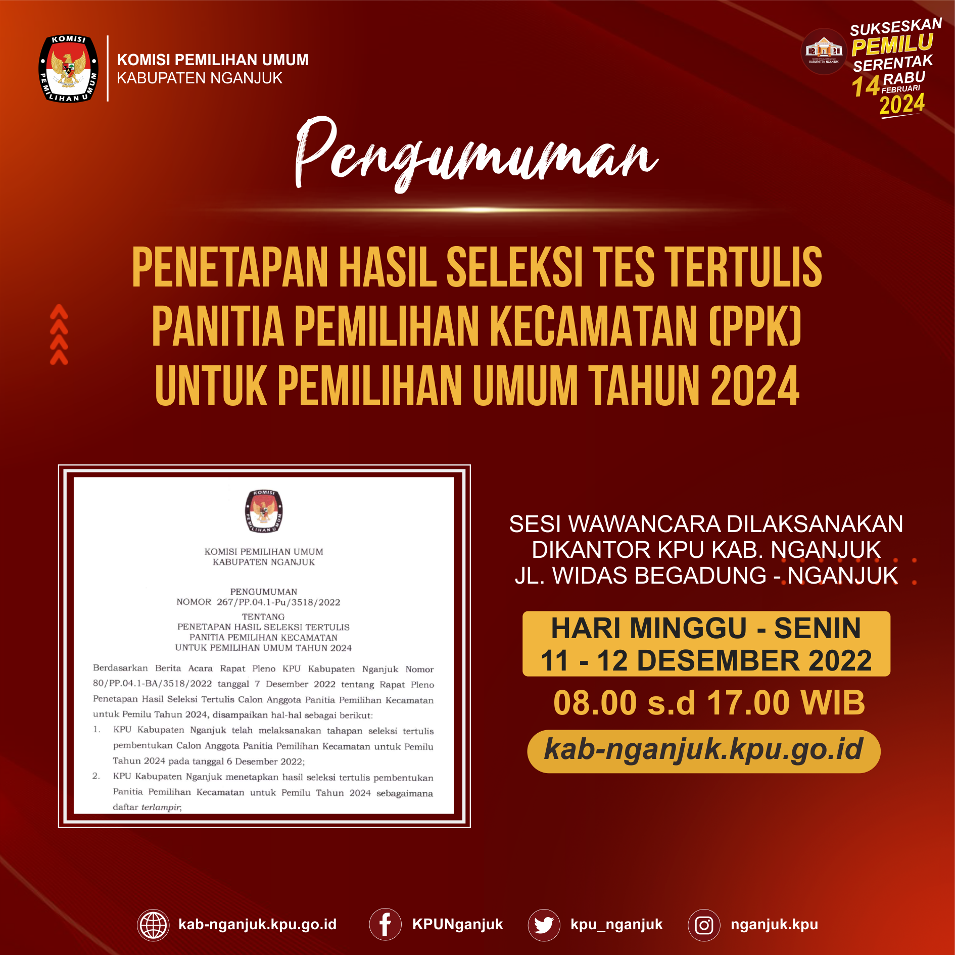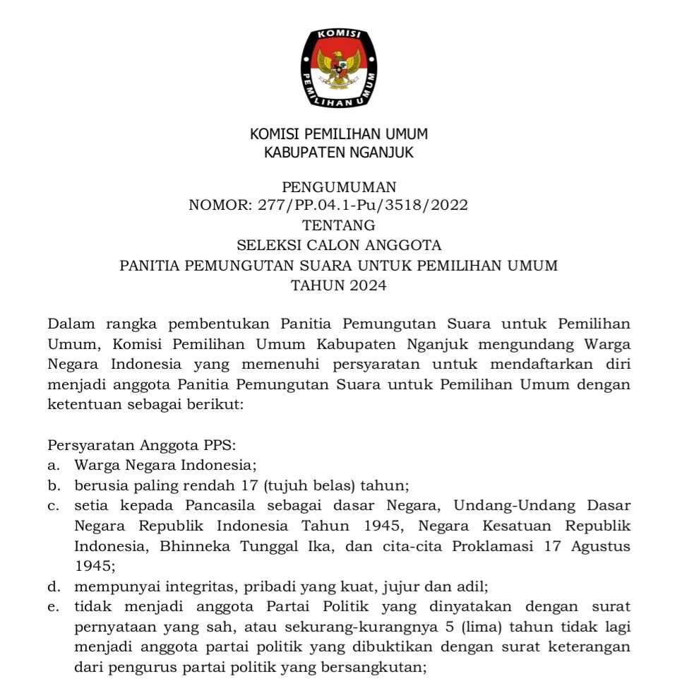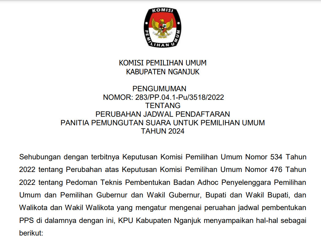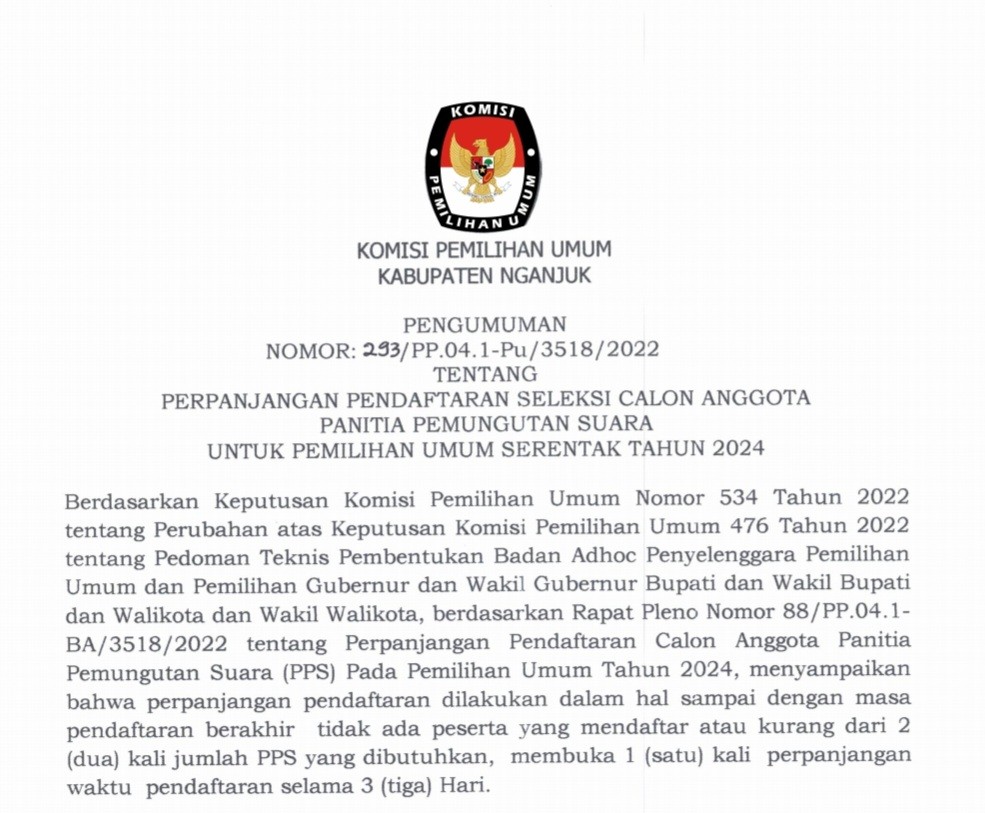 KPU Nganjuk- Berdasarkan Keputusan Komisi Pemilihan Umum (KPU) Nomor 534 Tahun 2022 tentang Perubahan atas Keputusan Komisi Pemilihan Umum 476 Tahun 2022 tentang Pedoman Teknis Pembentukan Badan Adhoc Penyelenggara Pemilihan Umum dan Pemilihan Gubernur dan Wakil Gubernur dan Bupati dan Wakil Bupati dan Walikota dan Wakil Walikota, Rapat Pleno KPU Nganjuk Nomor 88/PP.04.1-BA/3518/2022 tentang Perpanjangan Pendaftaran Calon Anggota Panitia Pemungutan Suara (PPS) pada Pemilu 2024, menyampaikan bahwa perpanjangan pendaftaran dilakukan dalam hal sampai dengan masa pendaftaran berakhir tidak ada peserta yang mendaftar atau kurang dari 2 kali jumlah PPS yang dibutuhkan, membuka 1 (satu) kali perpanjangan waktu pendaftaran selama 3 (tiga) hari. Selengkapnya di Pengumuman Perpanjangan pendaftaran seleksi PPS 2024