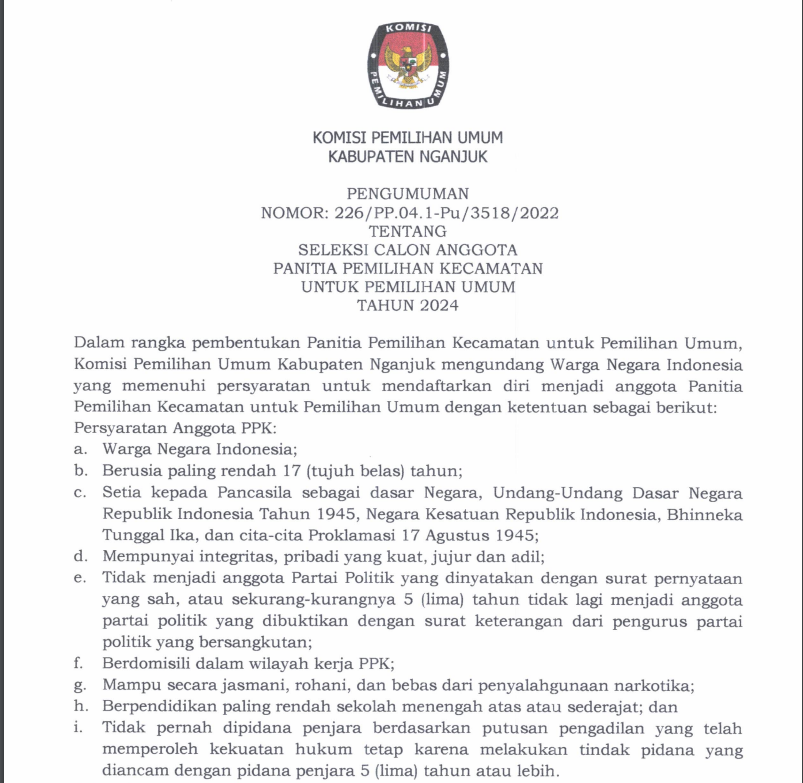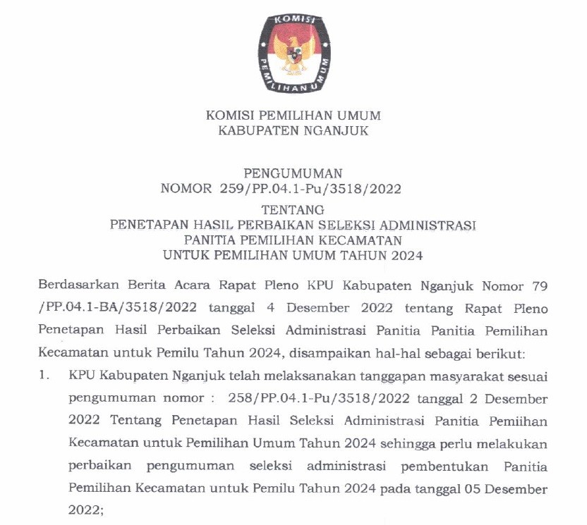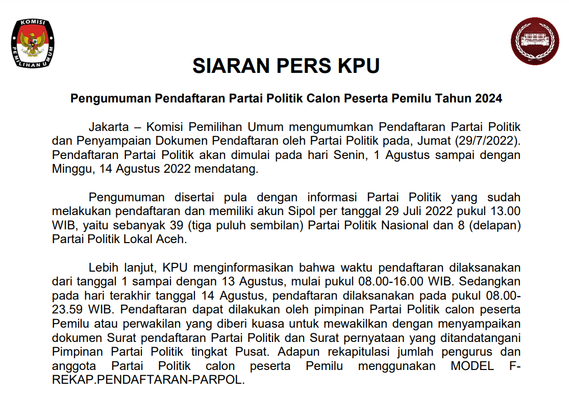 Jakarta– Komisi Pemilihan Umum mengumumkan Pendaftaran Partai Politik dan Penyampaian Dokumen Pendaftaran oleh Partai Politik pada, Jumat (29/7/2022). Pendaftaran Partai Politik akan dimulai pada hari Senin, 1 Agustus sampai dengan Minggu, 14 Agustus 2022 mendatang. Rilis selengkapnya dapat diunduh disini
