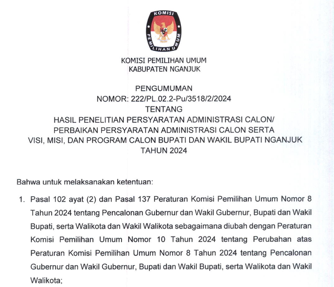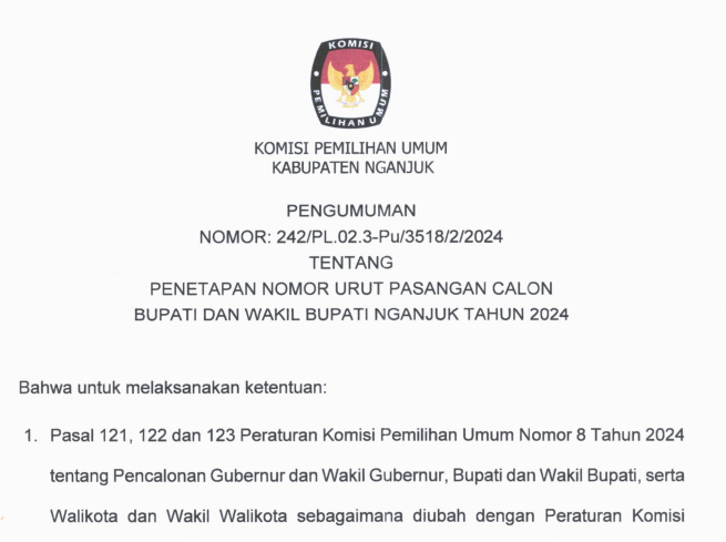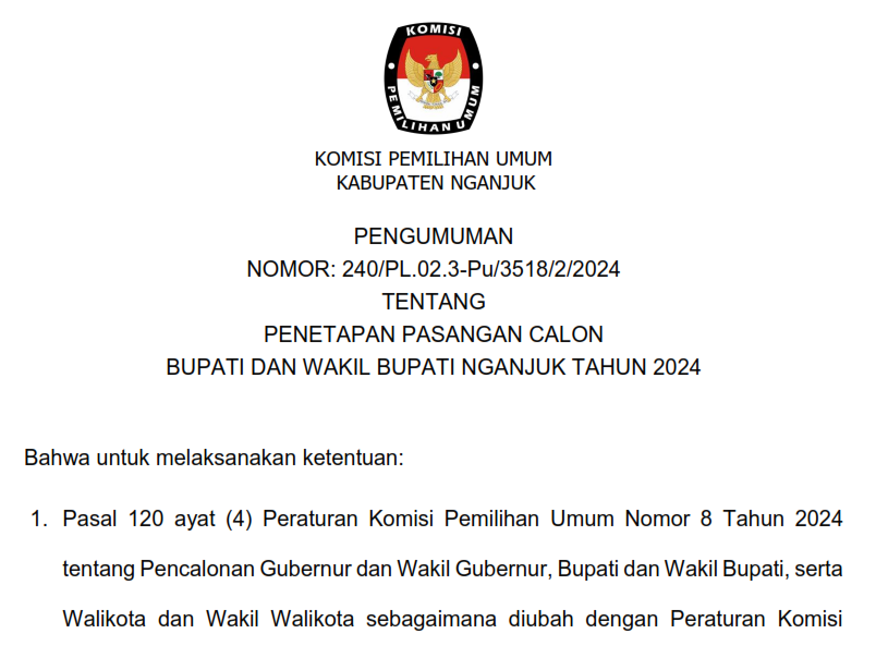 Keputusan Komisi Pemilihan Umum Kabupaten Nganjuk Nomor 992 Tahun 2024 tentang Penetapan Pasangan Calon Peserta Pemilihan Bupati Dan Wakil Bupati Nganjuk Tahun 2024.