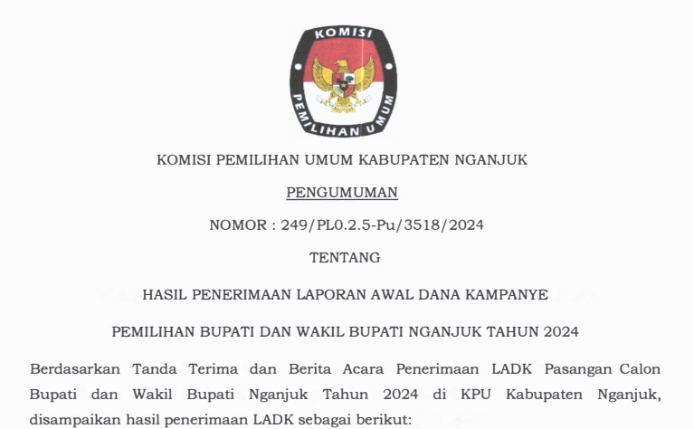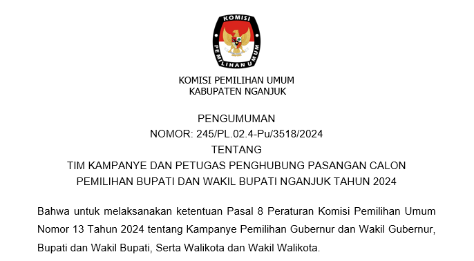 Komisi Pemilihan Umum Kabupaten Nganjuk mengumumkan Pasangan Calon Bupati dan Wakil Bupati Nganjuk Tahun 2024, yang selengkapnya dapat diunduh melalui link: Penetapan Paslon Bupati dan Wakil Bupati Nganjuk 2024