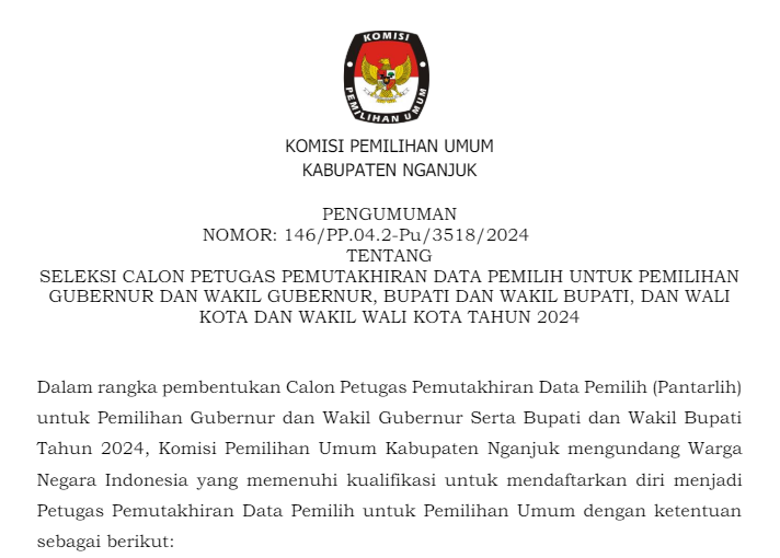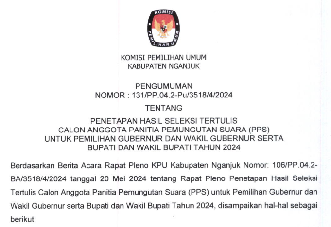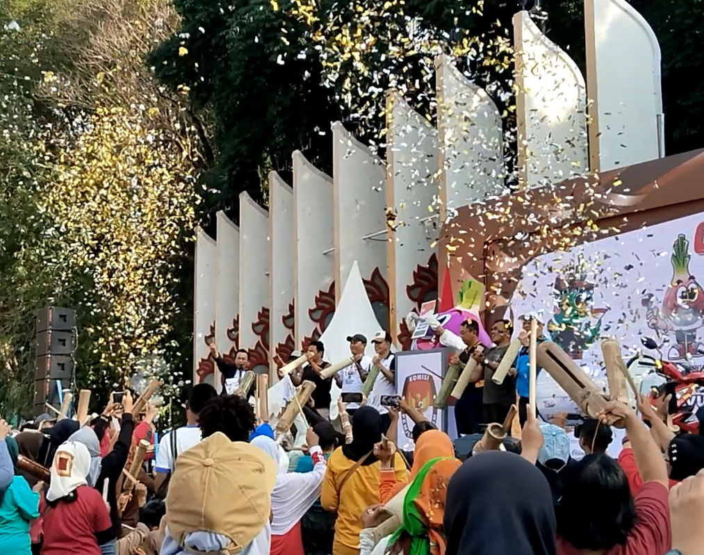 KPU Nganjuk- Pemukulan seribu kentongan bambu menjadi salah satu rangkaian unik dalam peluncuran Pemilihan Bupati-Wakil Bupati Nganjuk Tahun 2024 yang digelar Komisi Pemilihan Umum (KPU) Kabupaten Nganjuk di Alun-alun Nganjuk, Minggu (7/7/2024). Masyarakat yang mengikuti pemukulan seribu kentongan bambu ini terlihat antusias. Sebelum pemukulan seribu kentongan bambu, panitia yang sudah menyiapkan alat musik tradisional itu membagikan kepada masyarakat peserta jalan sehat dalam rangkaian Peluncuran Pemilihan Bupati-Wakil Bupati Nganjuk Tahun 2024. Pada saat pemukulan seribu kentongan berlangsung, tidak sedikit masyarakat yang terlihat berjoget dengan penuh kegembiraan. Pemukulan seribu kentongan ini juga ada ketentuan dari panitia. Di mana peserta diajak memukul sebanyak 27 kali pukulan. “Kenapa 27 kali pukulan. Karena pelaksanaan Pemilihan Gubernur-Wakil Gubernur Jawa Timur dan Bupati-Wakil Bupati Nganjuk nanti pada tanggal 27 November 2024,” kata Arfi Mustofa, Ketua KPU Nganjuk. Peluncuran Pemilihan Bupati-Wakil Bupati Nganjuk Tahun 2024 diawali dengan jalan sehat. Rute jalan sehat yaitu start di sisi timur panggung Alun-alun Nganjuk menuju jalan Merdeka. Kemudian berlanjut melewati jalan Diponegoro dan jalan Yos Sudarso hingga berbelok ke kanan di tugu Jaya Stamba jalan A Yani. Usai jalan sehat, kemudian dilanjutkan dengan kegiatan formal dimulai dengan menyanyikan lagu kebangsaan Indonesia Raya serta mendengarkan jingle Pemilihan Gubernur-Wakil Gubernur Jatim. Kemudin dilanjutkan dengan sambutan dari Ketua KPU Nganjuk. Setelah itu, peluncuran dilaksanakan ditandai dengan prosesi Ketua KPU Nganjuk Bersama Forum Pimpinan Kepala Daerah (Forkopimda) memasukkan bawang merah ke dalam kotak berlogo KPU. Pada saat yang bersamaan, muncul maskot Sang Bram. Beberapa waktu kemudian, Ketua KPU Nganjuk Bersama Forpimda serta ribuan peserta memukul kentongan bambu bersama-sama. Pemukulan kentongan seribu kentonga ini merupakan cara yang dipilih panitia dengan berbagai pertimbangan. “Kentongan bambu ini merupakan salah satu alat musik tradisional yang sudah ada sejak lama di Indonesia. Biasanya digunakan untuk menyampaikan sesuatu atau kabar kepada Masyarakat. Nah, pada momentum peluncuran ini ada pemukulan seribu kentongan dengan maksud kami ingin menyampaikan serta memberitahukan kepada masyarakat bahwa tahapan Pemilihan Bupati-Wakil Bupati Nganjuk Tahun 2024 sudah dimulai,” jelas Arfi. Adapun setelah pemukulan seribu kentongan, acara dilanjutkan dengan mendengarkan jingle Pemilihan Bupati-Wakil Bupati Nganjuk Tahun 2024. Hingga akhirnya kegiatan diakhiri dengan pembagian hadiah undian kepada peserta yang mengikuti jalan sehat. Arfi manyatakan, pihaknya menyampaikan terima kasih kepada semua pihak yang terlibat dalam kegiatan tersebut. “Termasuk kepada masyarakat yang sudah antusias mengikuti kegiatan Peluncuran Pemilihan Bupati-Wakil Bupati Nganjuk ini kami menyampaikan terima kasih. Serta kami mohon doa semoga pelaksanaan seluruh tahapan Pilkada Serentak 2024 bisa berjalan lancar sesuai ketentuan,” tandasnya.