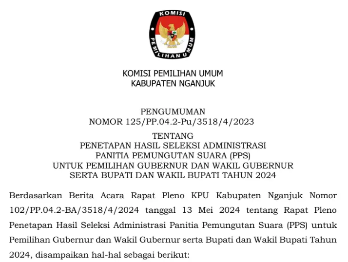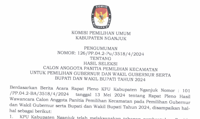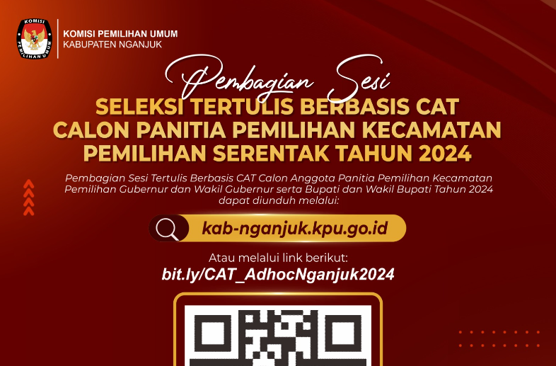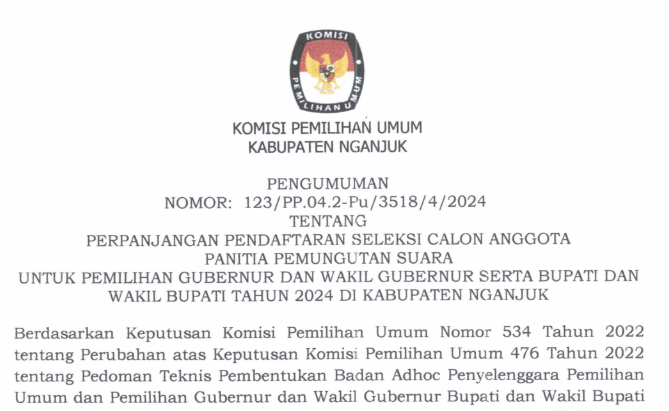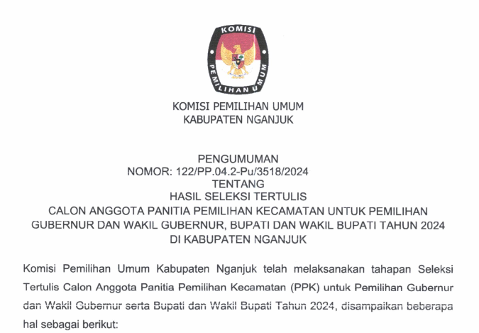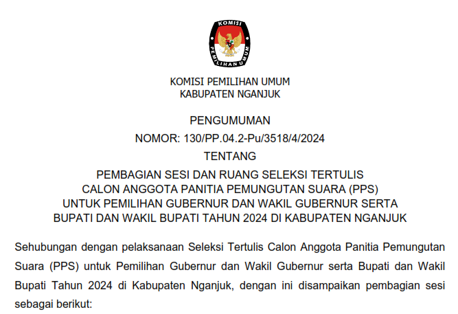 KPU Nganjuk- KPU Kabupaten Nganjuk telah melaksanakan Tahapan Seleksi Tertulis Calon Anggota Panitia Pemilihan Kecamatan (PPK) untuk Pemilihan Gubernur dan Wakil Gubernur, Bupati dan Wakil Bupati Tahun 2024 di Kabupaten Nganjuk, Pengumuman selengkapnya dapat diunduh di : Pengumuman Hasil Seleksi tertulis PPK Pilkada 2024.