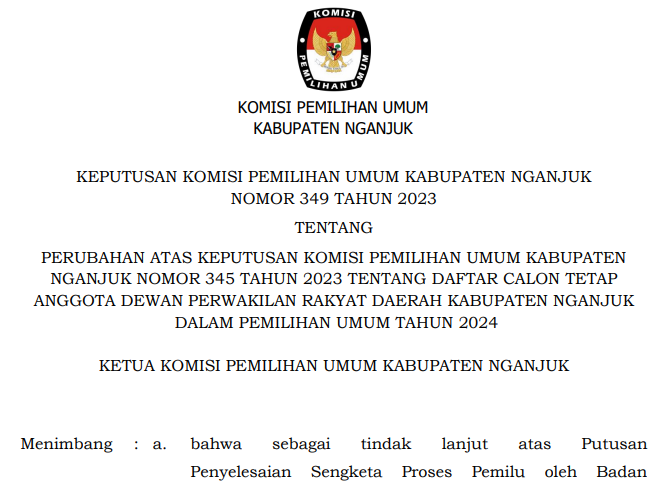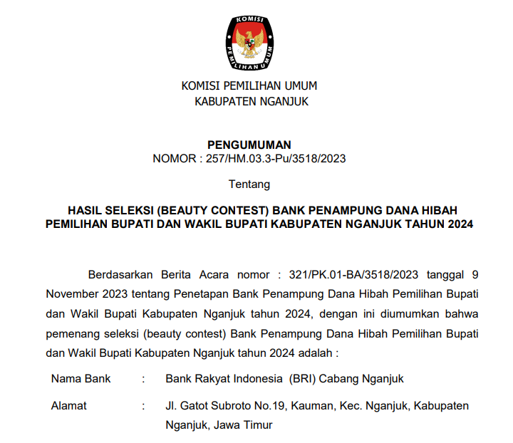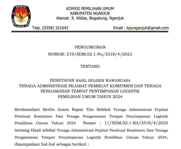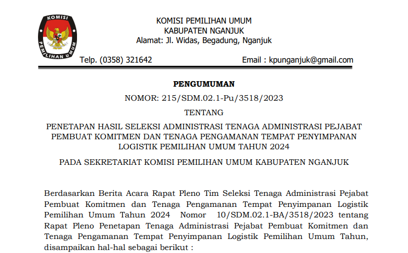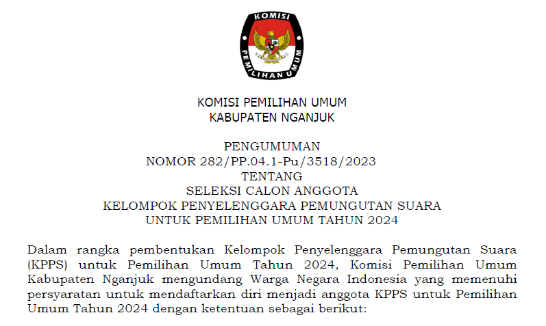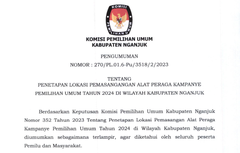 KPU Nganjuk- Berdasarkan Keputusan Komisi Pemilihan Umum Kabupaten Nganjuk Nomor 352 Tahun 2023 Tentang Penetapan Lokasi Pemasangan Alat Peraga Kampanye Pemilihan Umum Tahun 2024 di Wilayah Kabupaten Nganjuk, diumumkan sebagaimana terlampir,agar diketahui oleh seluruh peserta Pemilu dan Masyarakat. Pengumuman selengkapnya dapat diunduh DISINI.