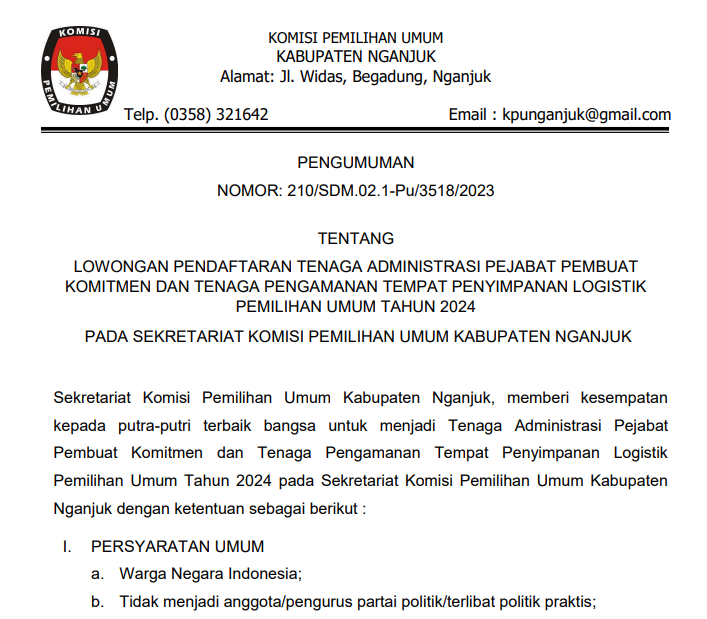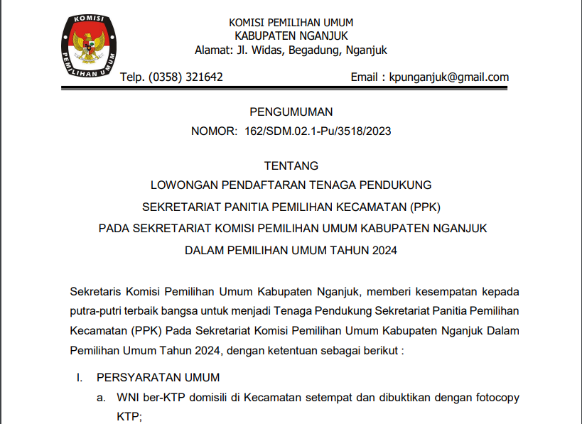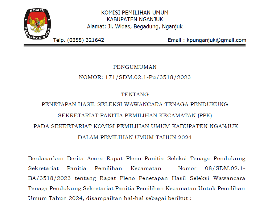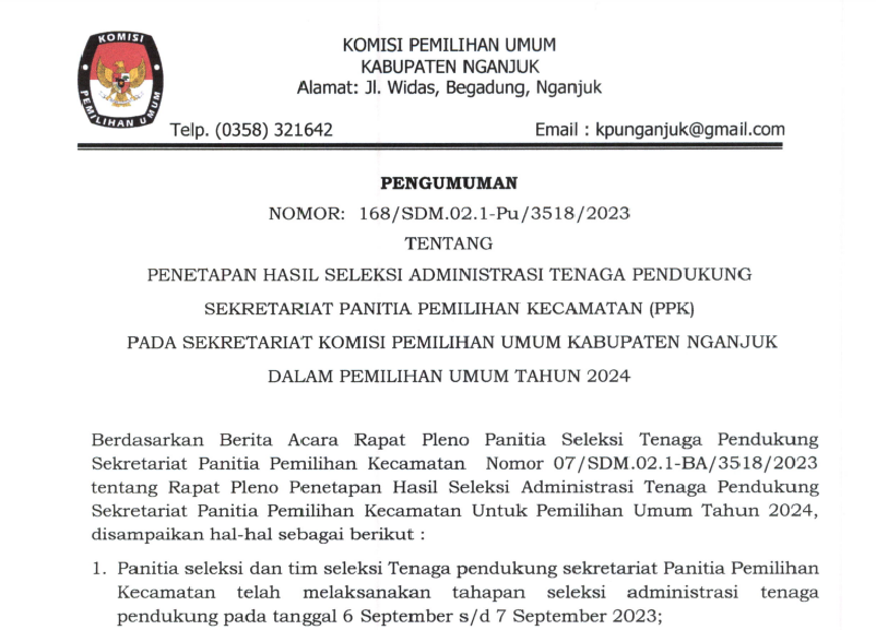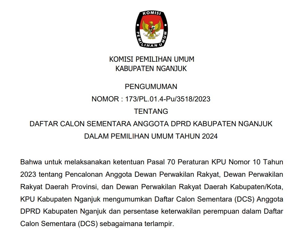KPU Nganjuk- Bahwa untuk melaksanakan ketentuan Pasal 70 Peraturan KPU Nomor 10 Tahun 2023 tentang Pencalonan Anggota Dewan Perwakilan Rakyat, Dewan Perwakilan Rakyat Daerah Provinsi, dan Dewan Perwakilan Rakyat Daerah Kabupaten/Kota, KPU Kabupaten Nganjuk mengumumkan Daftar Calon Sementara (DCS) Anggota DPRD Kabupaten Nganjuk dan persentase keterwakilan perempuan dalam Daftar Calon Sementara (DCS) sebagaimana terlampir. Berkenaan dengan hal tersebut, sesuai dengan ketentuan Pasal 71 Peraturan KPU Nomor 10 Tahun 2023 tentang Pencalonan Anggota Dewan Perwakilan Rakyat, Dewan Perwakilan Rakyat Daerah Provinsi, dan Dewan Perwakilan Rakyat Daerah Kabupaten/Kota, bahwa masyarakat dapat menyampaikan masukan dan tanggapan terhadap calon sementara Anggota DPRD Kabupaten Nganjuk yang tercantum dalam Daftar Calon Sementara (DCS) dari tanggal 19 - 28 Agustus 2023. Pengumuman selengkapnya di : Pengumuman-DCS-Kabupaten-Nganjuk