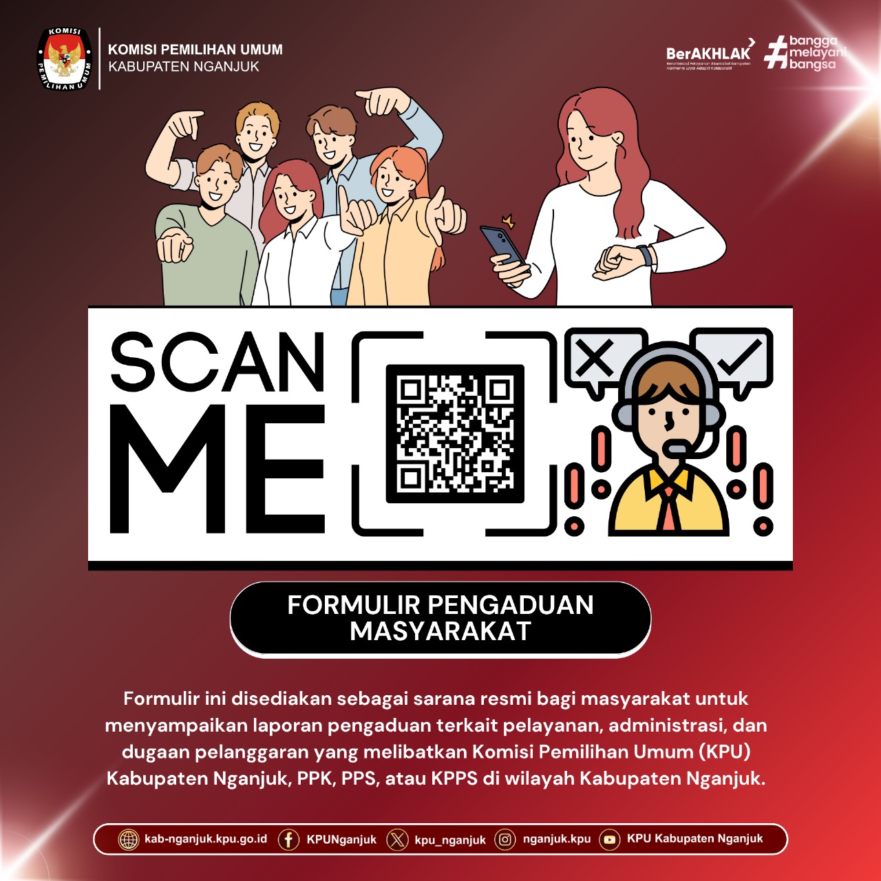 Hai Teman Pemilih Masyarakat Kabupaten Nganjuk, berikut adalah sarana resmi untuk menyampaikan laporan terkait pelayanan, administrasi dan dugaan pelanggaran yang melibatkan KPU Kabupaten Nganjuk maupun jajaran Badan Adhoc (PPK, PPS dan KPPS) di wilayah Kabupaten Nganjuk.